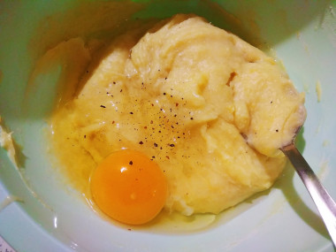 В картофельное пюре добавьте яйцо, соль и перец. Тщательно размешайте. Если вам покажется, что одного яйца маловато, можете добавить еще одно.