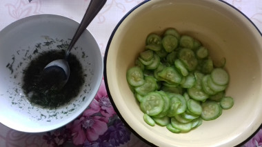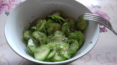 Быстрые маринованные кабачки мгновенного поедания - одна из наших любимых летних закусок. Пару лет назад открыла для себя этот чудо рецепт. Решила побаловать своих вкуснейшими кабачками. Кстати, они не только мега вкусные, но и очень полезные, так как не проходят термическую обработку. Для приготовления беру самые маленькие, молоденькие кабачки и нарезаю ножом очень тонко. Присолив кружки кабачков, оставляю на полчаса, как описано в рецепте. Они выделяют сок и хорошо просаливаются за это время. Сок сливаю и кабачки отжимаю по совету автора. Для маринада смешала всё по списку. Из зелени добавила свежий укроп. Кабачки в маринаде оставляю в холодильнике на ночь и закуска готова. По вкусу маринованные кабачки немного напоминают малосольные огурцы. Съедаются и вправду мгновенно. Советую сразу удвоить количество продуктов)