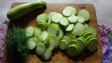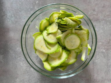 Кабачки помойте и обрежьте кончики. Нарежьте кабачки очень тонкими кружочками или слайсами. Можно ножом, можно на терке. Молодые кабачки режьте вместе с кожицей.