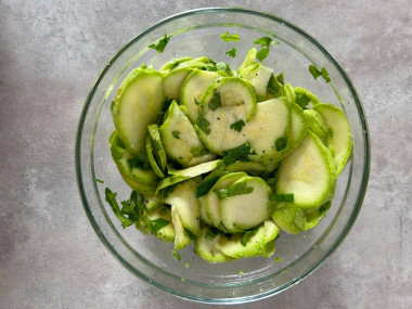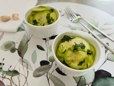 нам очень нравятся такие кабачки...готовим их круглый год..ещё я морковку иногда добавляю,порезанную по-корейски.потом в рулетик скручиваю полосочку кабачком с морковкой...и как бы уже и празднично