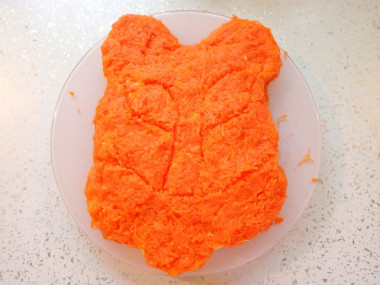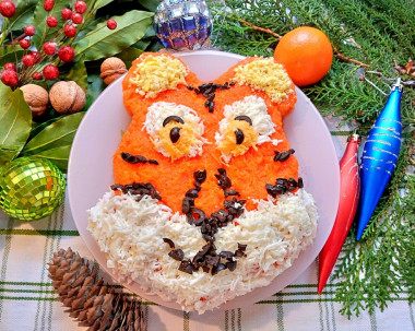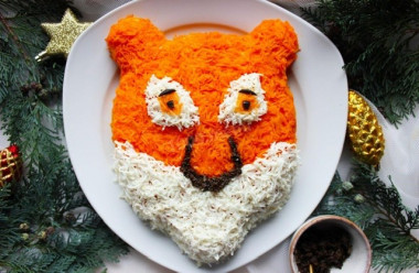 Салат внутри Тигра может быть абсолютно любой на ваш вкус. Главное, чтобы в составе была варёная морковь, которая в данном случае идёт верхним завершающим слоем.