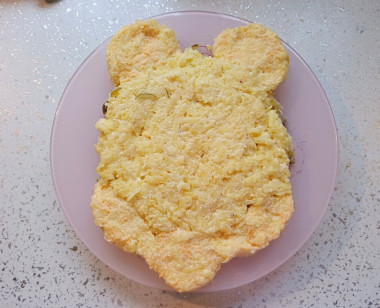 Для формирования ушек, щёк и подбородка одну-две картофелины натрите на крупной тёрке, добавьте сыр с майонезом и перемешайте.