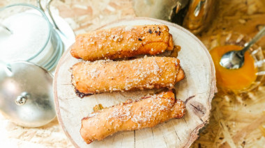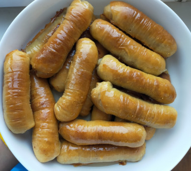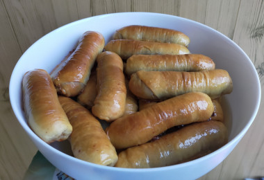 Таким образом сверните 20 рулетиков. Смажьте форму для запекания сливочным маслом и выложите на нее приготовленные рулеты плотно друг к другу. Яичный желток смешайте с ложкой молока и смажьте этой смесью каждый рулетик. Далее отправьте форму в разогретую до 200 °С духовку примерно на 10-15 минут. Время и температура указаны приблизительно, ориентируйтесь на свою печку. Об особенностях работы духовок читайте в статье в конце рецепта.