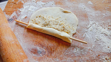 Выложите на пластинку начинку, примерно 2 столовые ложки, отступая 2-3 сантиметра от краев пластины. Сверху положите карандаш или небольшую палочку.