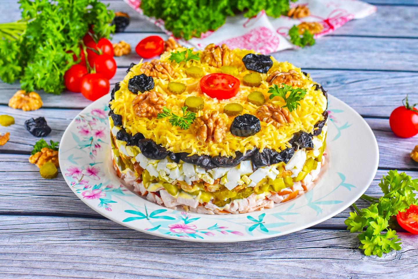 Слоеные салаты, особенно с черносливом и грецкими орехами, — классика постсоветского праздничного стола. Они стали популярны благодаря доступности ингредиентов и впечатляющему внешнему виду. Сочетание мяса, соленостей и сладких сухофруктов характерно для восточноевропейской и кавказской кухонь.