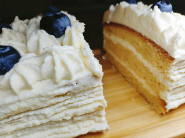 Я выпекала в икеевской прямоугольной форме и сразу себе представляла, как нарежу тортик в форме пирожных. Бисквит поднялся хорошо. Впервые слышу такую подсказку по поводу бортиков. Маслом смазала только дно, и тесто поднялось высоко. Благодарю за совет! Очень ценно! Сметана у меня была жирная от фабрики моего города. Сверху в баночке отслоилась сыворотка, и перед замесом крема я ее аккуратно слила в раковину.