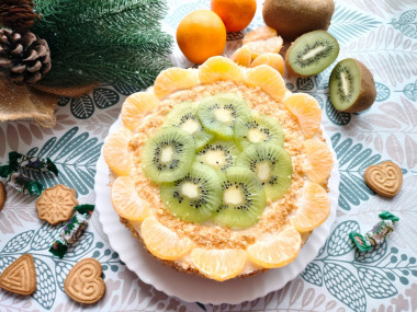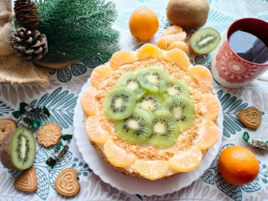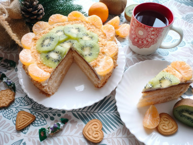 Чтобы усилить впечатление от торта, его верхушку я решила украсить кусочками фруктов, они подчеркнули изысканность и роскошь этого десерта. Бока тортика обсыпала бисквитной крошкой.