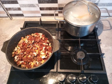 Тем временем подготовьте зажарку. В сковороде разогрейте сливочное масло. Выложите лук и жарьте, помешивая, до прозрачности.