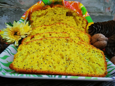 Увидела в ленте этот кекс и сразу решила, что обязательно испеку его. Уж больно он красивый, яркий, сразу хочется попробовать) Тесто у меня получилось достаточно густое, кремообразной консистенции, очень приятное воздушное. Меня порадовало в составе наличие лимона, люблю лимонную выпечку. Готовый кекс вышел таким красивым! Он желтенький, яркий как солнышко. Мак и лимонная цедра очень хорошо дополняют ароматную выпечку. Сам кекс воздушный, пористый, легкий. Внутри мягкий, а корочка хрустящая. Отчетливо чувствуется вкус лимона, цитрусовый аромат тоже сильный. Куркуму на вкус не почувствовала, а вот цвет она дает потрясающий! Однозначно кекс буду печь еще много раз, рекомендую всем. Такую нарядную выпечку можно подать гостям к чаю. Спасибо за рецепт!