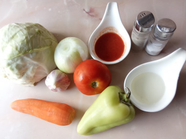Как потушить свежую капусту в мультиварке? Подготовьте продукты, необходимые для рецепта. Вместо томатной пасты можно взять томаты в собственном соку, кетчуп или использовать только свежие помидоры.