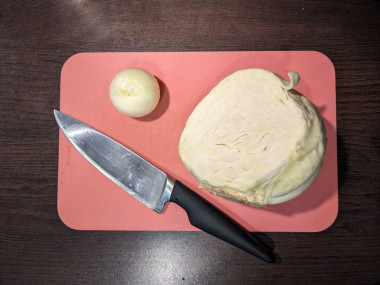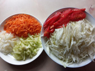 В это время с капусты удалите внешние подпорченные листы. Ополосните качан и помидор в воде. Капусту нашинкуйте тонкими полосками или небольшими кубиками, как вам более привычно. Помидоры нарежьте кусочками среднего размера. Предварительно по желанию снимите с томатов кожуру.