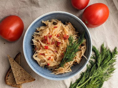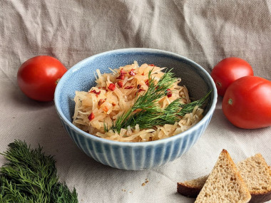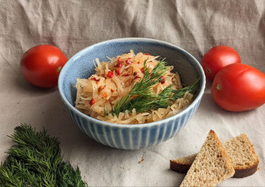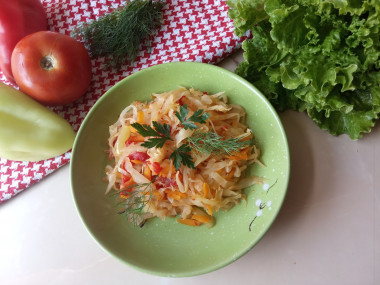 Больше всего в рецепте зацепило практически безучастное приготовление и добавление акцента в виде болгарского перца. Морковку в рецепт я не добавляла, а вместо свежего болгарского перца положила сушёный (ну, какой был). Самое долгое, пожалуй, это нашинковать капусту. У меня была капуста старого урожая, жесткая и не особо сочная, поэтому шинковала очень тонко.