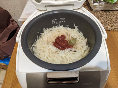 В мультиварке обжарила лук на масле, затем добавила всю капусту. Протушила минут 20 и добавила томатную пасту, специи и сушеный перец.