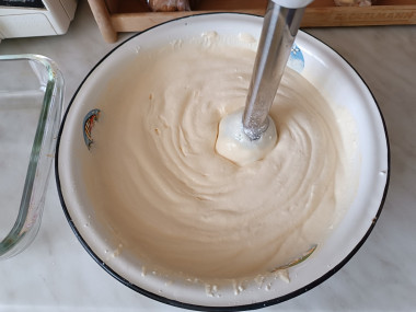 Белки взбейте миксером до стойких пиков. Добавьте их в миску и очень аккуратно, "закапывающими" движениями, вмешайте в творожную массу. Лучше использовать для этой цели силиконовую лопатку — она не разрушает структуру взбитых продуктов.