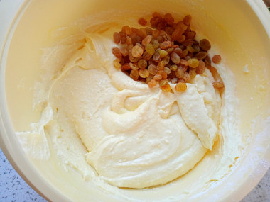 Первым делом подготовьте изюм. Хорошо промойте его и залейте горячей водой. Оставьте на 10-15 минут. За это время изюм станет мягким.