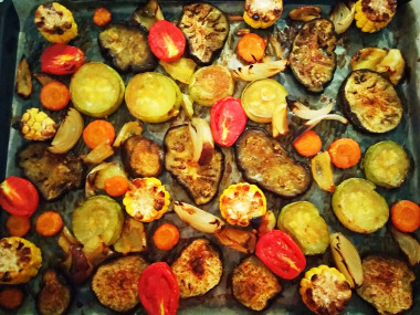 По прошествии этого времени овощи выложите на смазанный подсолнечным маслом противень. Помидоры черри положите запекаться целиком. Запекайте их в разогретой до 200 градусов духовке в течение 20 минут. Затем переверните овощи на другую сторону и пеките ещё 15 минут. За 5 минут до готовности овощей включите режим "Гриль" и, постоянно наблюдая за состоянием овощей, доведите их до нужной степени румяности. Подавайте овощи сразу после приготовления.