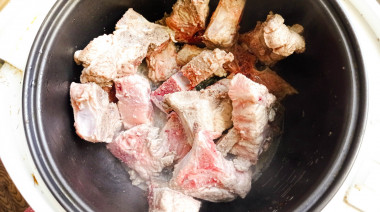 У меня были кусочки свинины на кости. Решила приготовить их на ужин, основываясь на рецепте свинины в сметанном соусе в мультиварке.