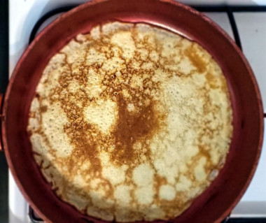 В сковороде на средне-сильном разогрейте немного растительного и сливочного масла. Масло должно полностью покрывать дно сковороды. Вылейте половником немного теста и быстро распределите по всей поверхности сковороды. Выпекайте блинчик 1-2 минуты до румяной корочки, затем переверните на другую сторону и жарьте столько же. Точно также пожарьте остальные блины.