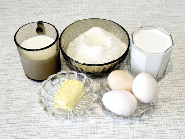 Как испечь блины царские? Очень просто! Тесто замешивается за несколько минут. Для начала подготовьте необходимые ингредиенты по списку. Муку берите высшего сорта. Яйца лучше берите крупные отборные. Сливки подойдут любой жирности. У меня 20%.