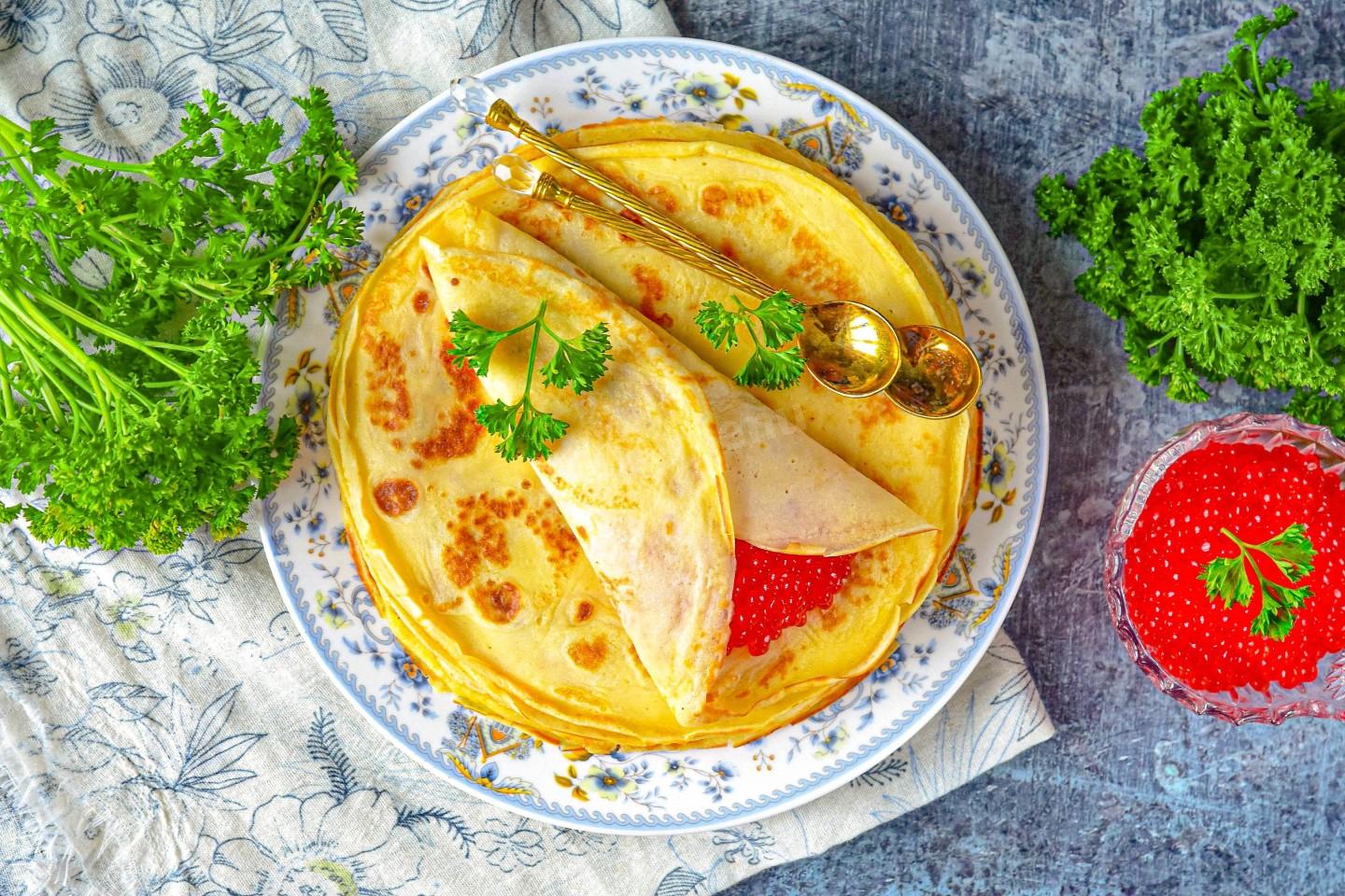 Готовые сытные блинчики выложите стопкой на блюдо и подавайте к столу. Я подавала с красной икрой и зеленью. Варианты подачи (LSI) Также горячие царские блины идеальны со сметаной, сливочным маслом и слабосоленой семгой. Сладкоежкам понравится вариант с творожным сыром, ягодами, вареньем или сгущенкой. Приятного аппетита!