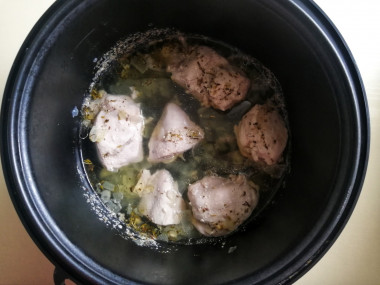 Затем подлейте в чашу немного горячей воды (примерно 200мл) Добавьте соль и специи на свой вкус. В качестве специи я использую молотый перец и немного паприки. Переключите мультиварку на режим "запекание" или "выпечка" на 30 минут и закройте крышку. Оставьте курицу готовиться.