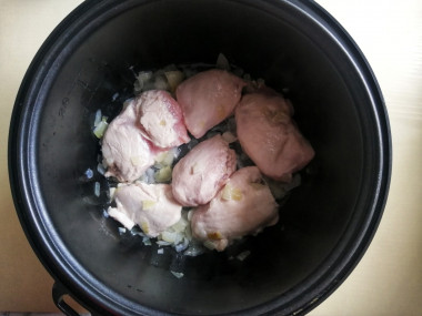 Затем выложите в чашу подготовленные кусочки курицы, перемешайте и обжаривайте все вместе 3-4 минуты, чтобы на курице не стало видно сырого мяса.