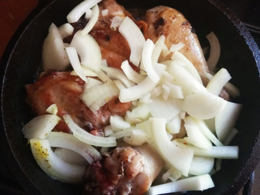 Через 10 минут мясо снова переверните, также поворошите лук, чтобы он не пригорел. Опять накройте сковороду крышкой и жарьте курицу на таком же умеренном огне еще 10 минут до готовности. Мясо проткните ножом: если нож входит легко и течет светлый сок, значит оно готово, если сок розового или красного цвета — нужно продолжить приготовление. Готовую курицу подавайте сразу же, горячей. Приятного аппетита!