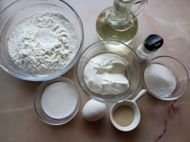 Как испечь домашнее печенье на сметане на дрожжах без маргарина в духовке? Подготовьте все необходимые ингредиенты. Сметана можно брать любой жирности, но обратите внимание, что чем жирнее продукт, тем калорийнее получится печенье. У меня 25%. Сметану и яйцо заранее достаньте из холодильника.