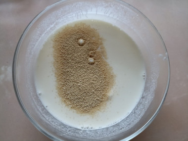 Молоко немного подогрейте и добавьте к нему дрожжи, столовую ложку сахара и сметану. Количество сахара можно регулировать по своему вкусу. Всё перемешайте и оставьте на 10-15 минут для активации дрожжей. Молоко должно быть именно теплым, но не обжигающим, иначе дрожжи в нем погибнут. О других нюансах работы с дрожжами читайте в отдельной статье, ссылка в конце рецепта.
