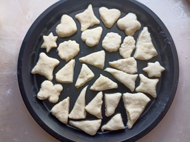 Из теста вырежьте заготовки печенья. Я воспользовалась формочками. Можно также использовать для этого стакан или рюмку.