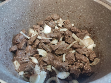 В глубокой сковороде разогрейте растительное масло. Помешивая, обжарьте мясо на сильном огне до появления золотистой корочки. В конце говядину посыпьте специями и перемешайте. Как выбрать сковороду и масло для жарки вы узнаете прочитав статьи в конце этого рецепта.