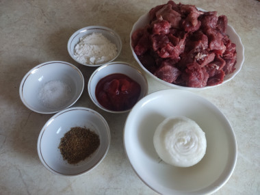 Как сделать гуляш из говядины с томатной пастой? Очень просто! Для начала подготовьте необходимые ингредиенты по списку. Чтобы мясо получилось сочнее, лучше использовать мякоть свежей говядины или телятины. Помимо соли и перца можете добавить свои специи по вкусу. Я добавила немного хмели-сунели. Растительное масло берите любое. У меня подсолнечное.