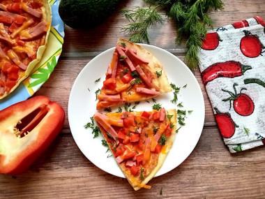 Вместо тонкого лаваша у меня была тортилья, она плотнее. Диаметр сковороды у меня меньше, но обрезать лепешку не стала. У готовой пиццы получился краешек, за который удобно брать рукой. Впервые я делала ленивую пиццу на сковороде подобным образом. Мне очень понравилась яичная прослойка! Переворачивать "блинчик" легко при помощи большой крышки. Из начинки у меня вареная колбаса и свежий сладкий болгарский перчик. Вместо помидоров смазала основу томатным кетчупом. Верх присыпала сыром. Готовила пиццу под крышкой на малом огне пока не расправился сыр, при этом низ лепешки стал слегка румяный.