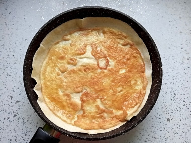 Когда омлет снизу поджарится, переверните лаваш на другую сторону.