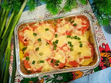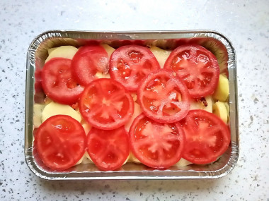 Помидоры нарежьте кружочками и выложите равномерным слоем по всей поверхности картофеля. Помидоры тоже можно немного подсолить. Накройте форму фольгой и поставьте в духовку, предварительно разогретую до 190 градусов, примерно на 35 минут.