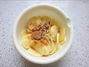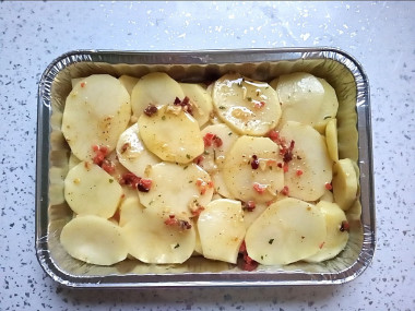Запекать решила в одноразовой форме. Картошку нарезала тонкими ломтиками и промыла водой от крахмала. Со специями смешала сразу в миске, а затем выложила слоями в форму. Использовала сушеные овощи и приправу для курицы. Сливок добавила побольше, чтобы они доходили почти до верхнего слоя картошки.