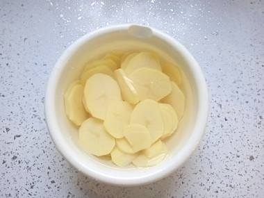 Для запекания можно использовать любую жаропрочную форму. У меня форма керамическая. Дно и бока формы смажьте растительным маслом. Очищенный картофель нарежьте кружочками и выложите в подготовленную форму, равномерно распределяя его по всей поверхности.