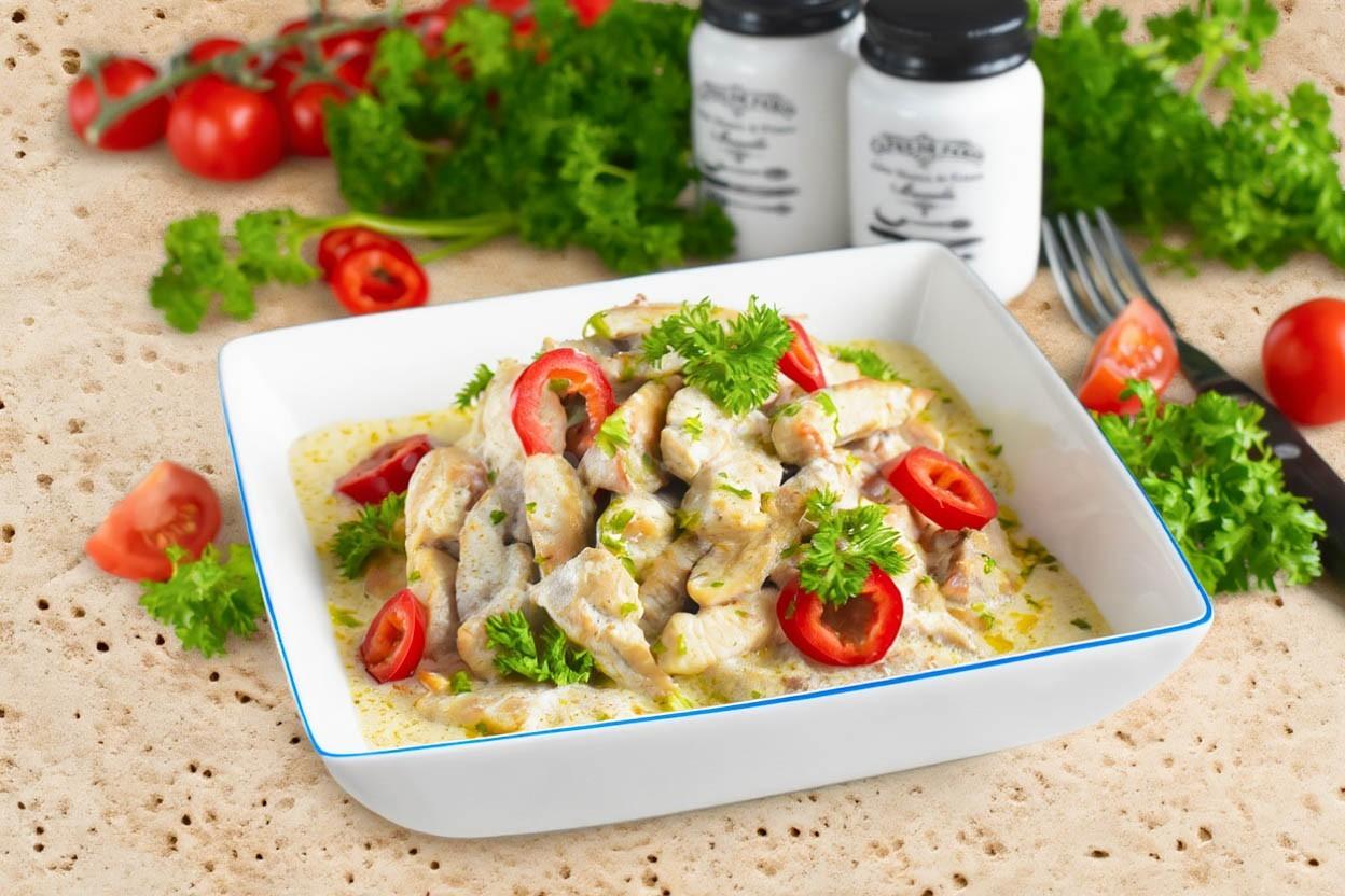 Низкокалорийный вариант: свинину заменить на куриное филе, сметану 10% и без масла — жарить на антипригарной сковороде с каплей воды.