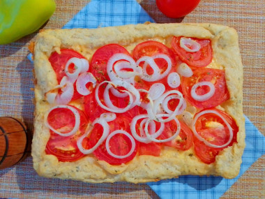 Испекла пирог с помидорами и сыром и была в полном восторге! Замесила по рецепту тесто с добавлением итальянских трав. Для начинки взяла твердый сыр, с помидорчиков кожуру не снимала и лук у меня был обычный. Сверху слегка присыпала итальянскими травами.