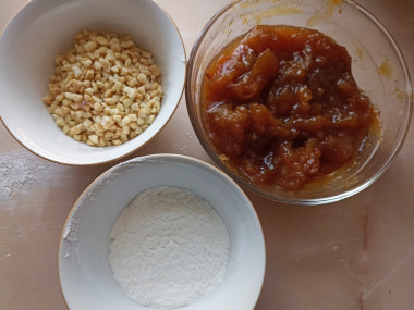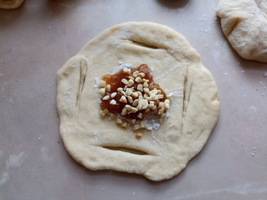 На середину лепешки выложите начинку (у меня были черничное варенье и абрикосовое повидло), посыпьте молотыми орехами. Сформируйте булочку.