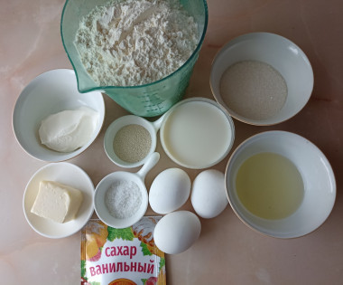 2. Яйца взбейте с сахаром, добавьте соль, ванильный сахар, масло сливочное, сметану, теплое молоко, просеянную муку. Затем вылейте подошедшие дрожжи и замесите тесто. Добавьте в тесто растительное масло, хорошо замешайте тесто и поставить подходить в теплое место на час.