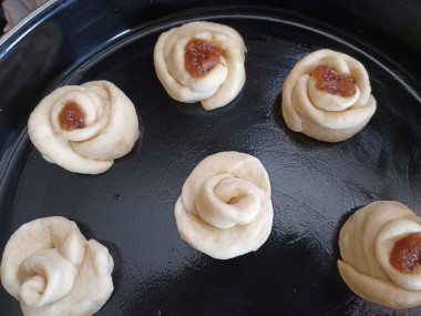 4. Смажьте противень растительным маслом. Положите булочки с вареньем на противень или выложите булочки на пергаментную бумагу, оставьте отдохнуть на 20-30 минут.