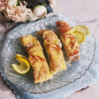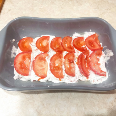 Обмазала каждый кусочек рыбы соусом, выложила в форму, смазанную растительным маслом. Сверху добавила полукольца помидорки и посыпала тертым сыром.