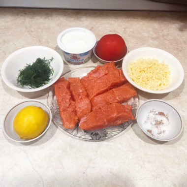 Рыба у меня была кижуч, которую я нарезала на порционные кусочки. Для соуса я смешала сметану, соль, перец, сок лимона и зелень укропа. Помидорку порезала полукольцами, сыр натерла на мелкой тёрке.