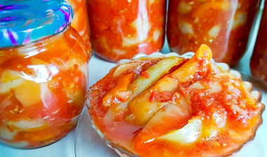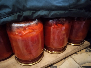 Понравилась мне такая заготовка, только помидоры уже закончились, к сожалению. Но я не опустила руки и сделала салат лечо на зиму, заменив помидоры томатной пастой. Все делала по рецепту, только вместо помидор взяла 500 мл воды и 400 г томатной пасты на 2 кг болгарского перца.