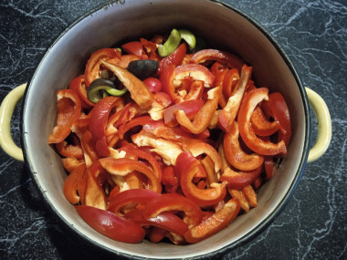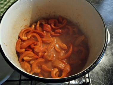 Болгарский перец нарежьте произвольными крупными кусочками, перьями, или полукольцами как вам больше нравится. Отправьте перец в большую кастрюлю.