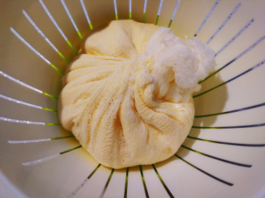 Дуршлаг застелите двумя слоями плотной марли. Если у вас марля с крупными ячейками, то сложите ее в 5 слоев. Отбросьте смесь на дуршлаг и дайте сыворотке стечь. В этом рецепте молочная сыворотка не используется, но не стоит избавляться от неё! Ведь на ее основе можно испечь, например, отличный сдобный хлеб или пышные оладьи.
