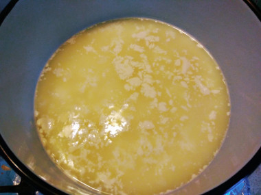 Сыворотка должна отделиться, а на поверхности будут плавать творожистые хлопья. Снимите сотейник с огня.