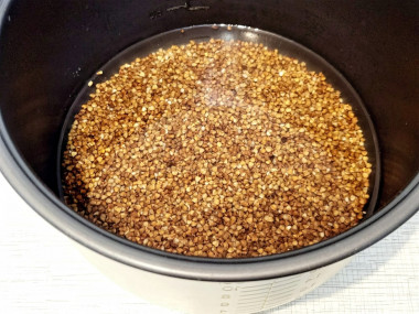 Выложите промытую гречку в чашу мультиварки. Влейте необходимое количество воды. Добавьте соль по вкусу. Я на 200-граммовый стакан кладу половину чайной ложки, но вы ориентируйтесь на свой вкус. Также можно добавить немного сахара, он усилит вкус каши.