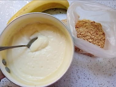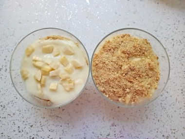 Возьмите порционную посуду — стаканы или креманки. На дно насыпьте крошку из печенья, сверху выложите слой банана. Далее положите несколько ложек пудинга. Повторите слои — печенье/банан/пудинг. Уберите десерт на полчаса в холодильник.